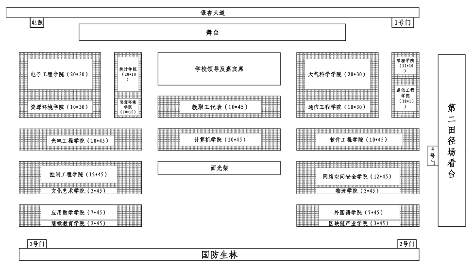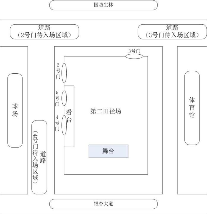5.演员及后勤基建处教职员工按照方案要求(附件1、附件3)在第二田径场看台指定位置有序就坐。校内其他零散观众如有观看需求,可从第二田径场5号门进入看台,并在指定位置有序就坐。