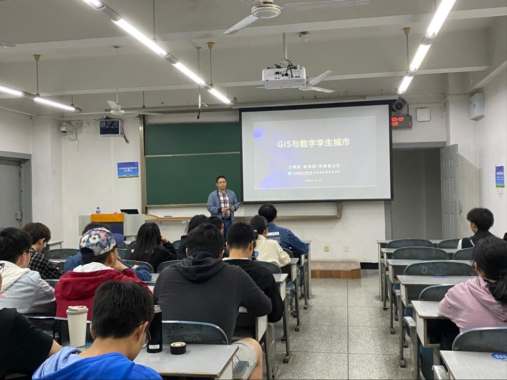 讲座中期,王老师讲解了“GIS技术与数字孪生城市”,让大家了解到孪生城市的意义在于让真实世界很高成本、很难实现的事情,可以在虚拟世界里低成本、快速的实现。并用一段模拟规划城市的项目宣传片,生动形象的让大家感受到了GIS技术与数字孪生城市的魅力。