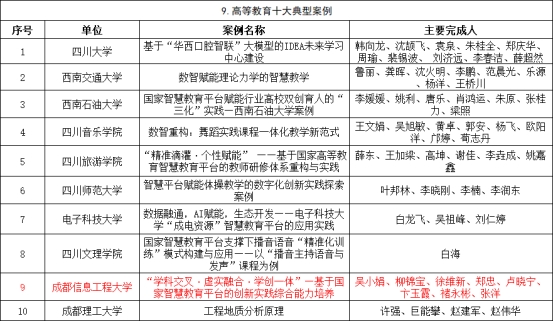 吴小娟团队申报的《“学科交叉·虚实融合·学创一体”——基于国家智慧教育平台的创新实践综合能力培养》,成功入选四川省高等教育十大典型案例,是我校首次斩获该项荣誉。