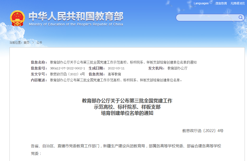 教育部公布了第三批全国党建工作示范高校、标杆院系、样板支部培育创建单位名单,彩经网 教工党支部成功入选“第三批全国党建工作样板支部”培育创建单位。这是彩经网 教工支部继2021年获四川省新时代高校党组织“对标争先”计划样板支部培育单位后的又一次突破。