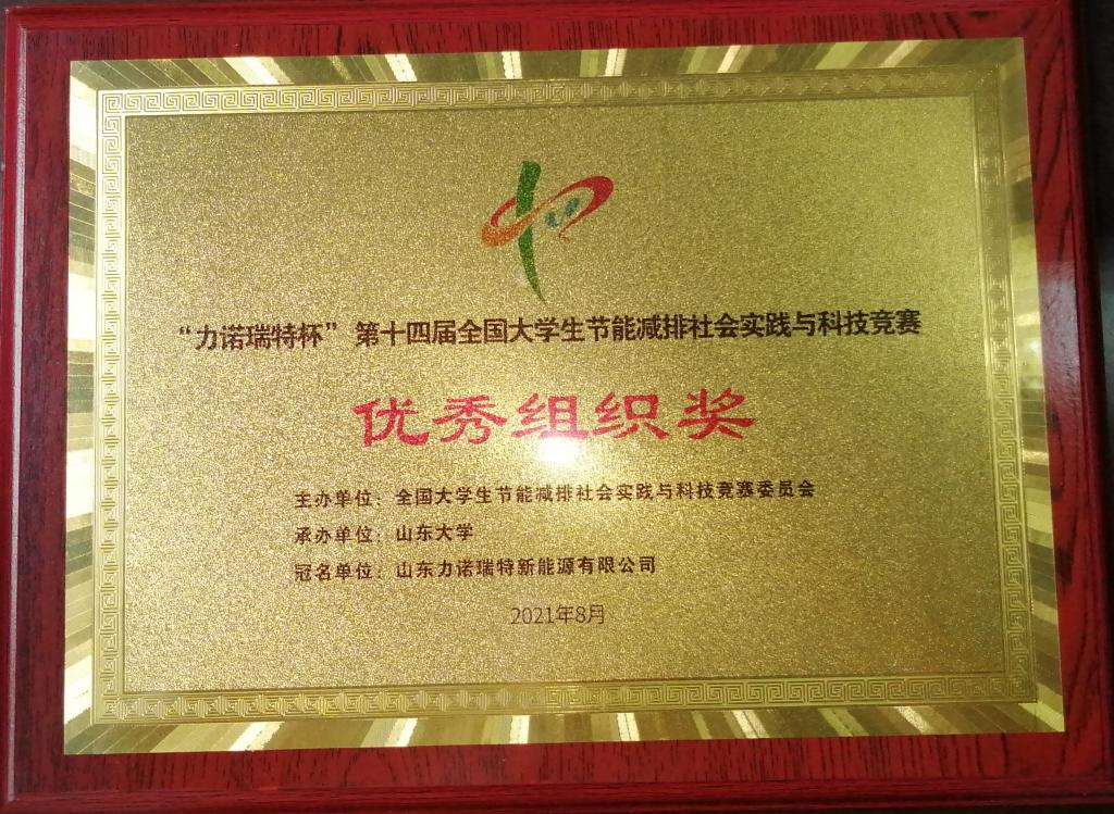 获“力诺瑞特杯”第十四届全国大学生节能减排社会实践与科技竞赛 “优秀组织奖”荣誉称号。