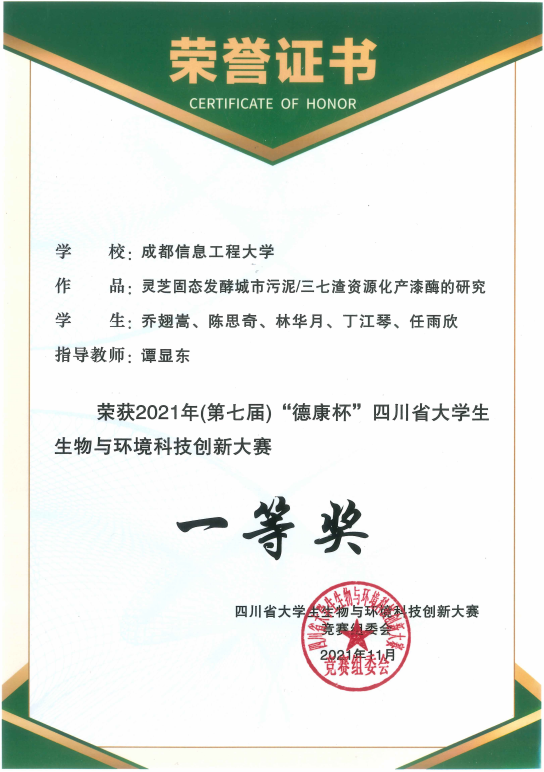 在本次大赛中有两件作品获奖:谭显东老师指导的乔翅嵩团队作品《灵芝固态发酵城市污泥/三七渣资源化产漆酶的研究》荣获一等奖,郝云庆老师指导的蒋梅团队作品《高校校园陆生脊椎动物多样性调查报告》获得三等奖。同时,谭显东老师荣获优秀指导教师奖。彩经网