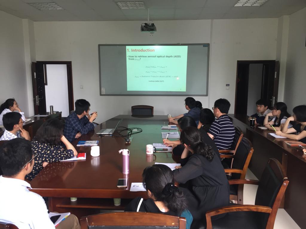 教师及研究生参加了第五期沙龙。由张洋老师为大家讲述题为“Retrieval of Aerosol Optical Depth Using the Empirical Orthogonal Functions (EOFs) Based on PARASOL Multi-angle Intensity Data”的研究。张老师从传统卫星遥感平台反演气溶胶光学厚度的局限入手,展开介绍了多角度遥感反演气溶胶光学厚度的方法与优势。主要讲到了利用经验正交函数这一多维数据分析工具估算地表反射率的方法,并展示了基于此得到的中国地区气溶胶光学厚度反演结果。相关的验证工作表明反演结果与地基测量结果有高度一致性,该方法亦可为我国高分五号相关载荷的气溶胶反演算法提供基础支撑。