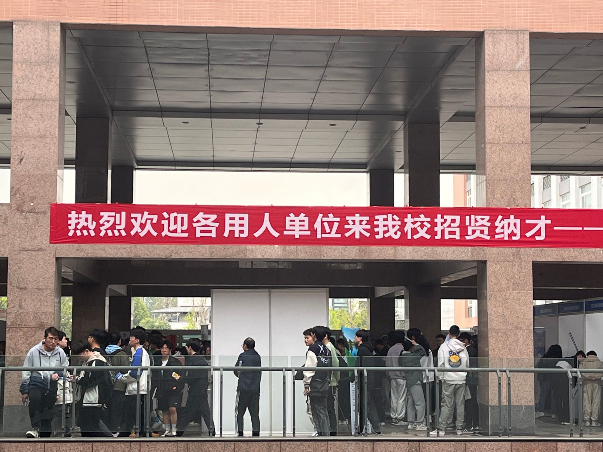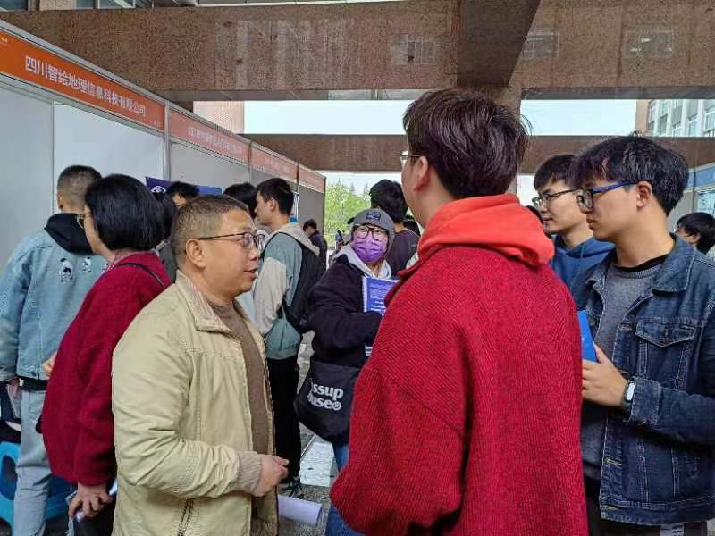 300余名毕业生冒雨参加了本次招聘会。招聘会现场人头攒动,每个展位前都有学生主动与招聘人员交流,了解单位用人要求等相关细节并积极投递个人简历。
