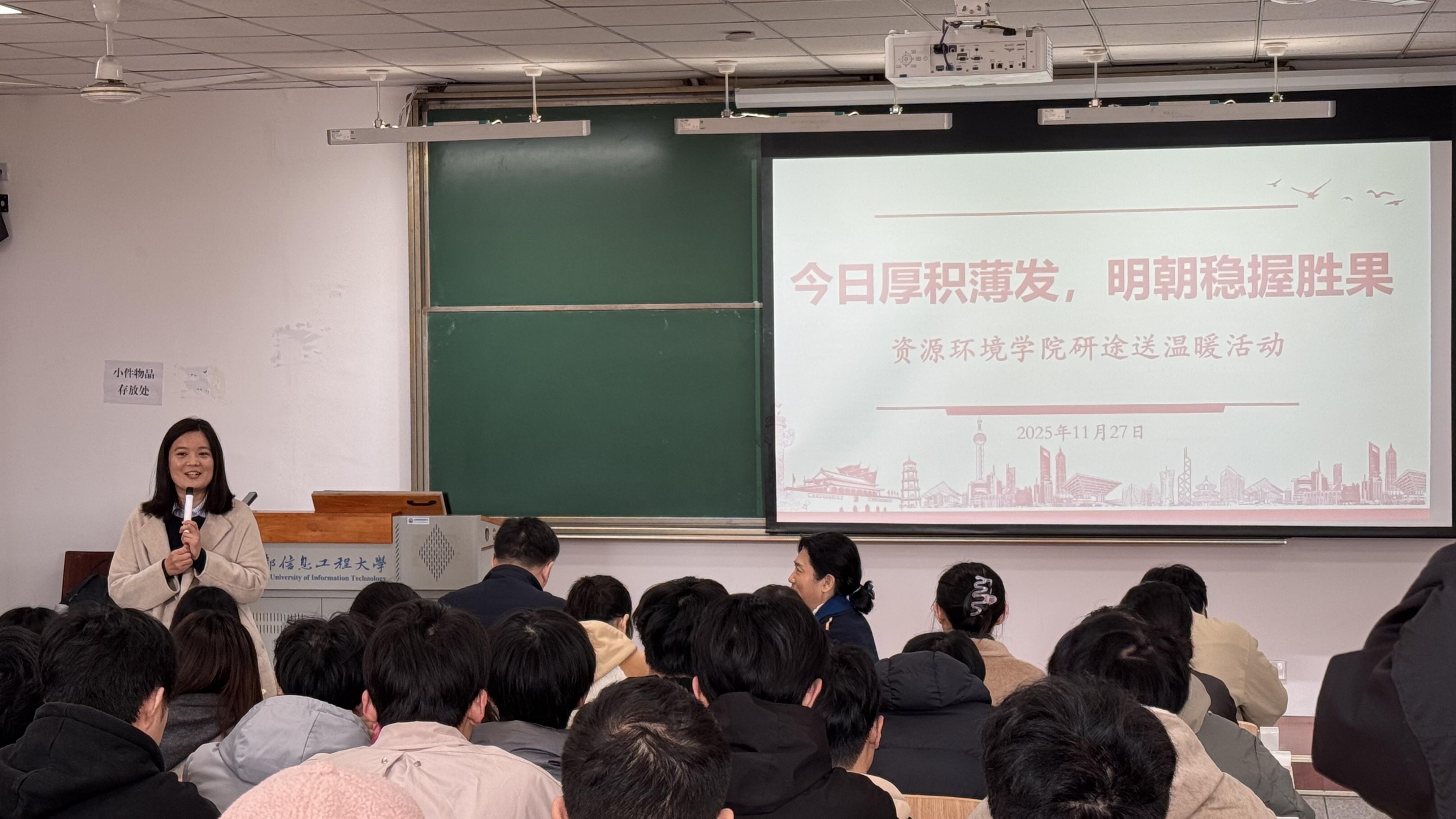 在1307教室举办 “今日厚积薄发 明朝稳握胜果”研途送温暖活动。徐成华院长、李蕖书记、方淑红副院长、卞玉霞副书记与辅导员江慧一同将暖心礼盒送到考研学子手中,为冲刺备考的同学们加油鼓劲、传递温情。