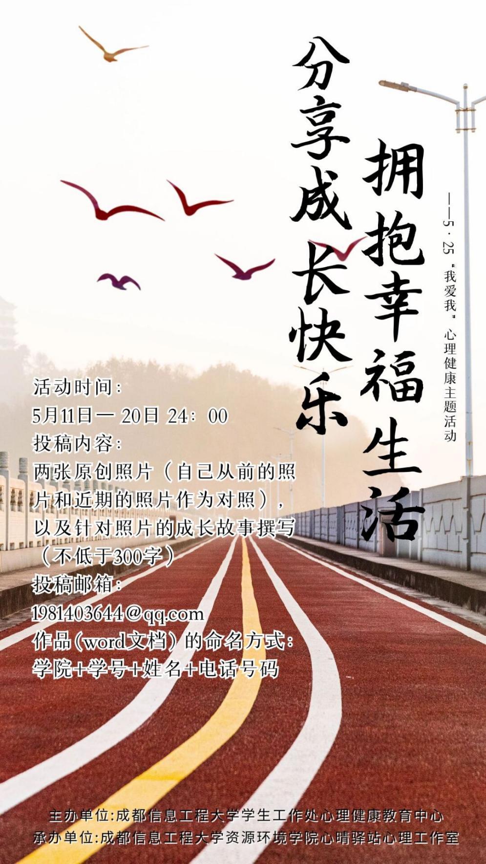 承办的5·25“我爱我”心理健康主题活动拉开帷幕。本次活动旨在帮助同学们回溯自身成长经历,在其中寻找幸福时刻,并认识自我、接纳自我、善爱自我。活动以“分享成长快乐,拥抱幸福生活”为主题的成长图片故事征集,引导同学们与他人分享自己的成长经历,感受成长中的快乐与幸福,展现当代大学生在成长中不断塑造积极健康的心理品质,勇于追求梦想、接纳自我的积极心态,并增进大学生之间的交流,携手共同建设美好校园。