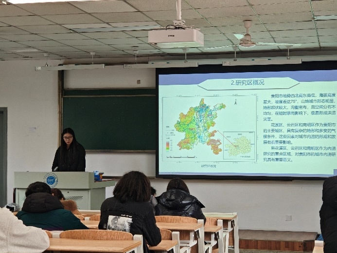 教师莅临指导。活动聚焦前沿科研议题,五位2023级研究生围绕环境遥感、土壤水文、城市内涝等方向展开学术分享,现场互动热烈,学术氛围浓厚。